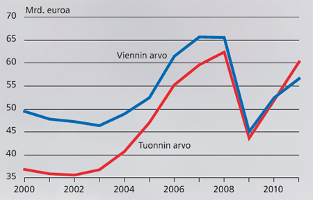 Kuviossa 1 on esitetty Suomen viennin ja tuonnin nimellisarvojen kehitys vuosina 2000 – 2011. Viennin arvo oli suurempi kuin tuonnin arvo lukuun ottamatta vuotta 2011. Kun tuonnin ja viennin arvot deflatoidaan kiinteähintaisiksi vuoden 2000 euroiksi, muuttuu kuva entistä positiivisemmaksi ja myös vuosi 2011 muuttuu ylijäämäiseksi (Kuvio 2). Samanlainen kehitys on jatkunut myös vuoden 2012 ensimmäisellä neljänneksellä.