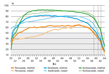 Koulutustasolla on suuri vaikutus työllisyysasteisiin. Perusasteen varaan jääneiden työllisyys kohoaa korkeimmillaankin vain 65 prosenttiin, keskiasteen tutkinto nostaa työllisyyden hieman yli 80 prosentin ja korkea-aste 90 prosenttiin. Kaikilla koulutustasoilla naisten työllisyys on miesten työllisyyttä alempaa noin 40 vuoden ikään saakka. Siitä eteenpäin naiset ovat miehiä enemmän työssä. Sitä ikää, jossa ikäluokasta 50 prosenttia on töissä, voidaan pitää keskimääräisenä aloitusikänä. Keskimääräinen poistumisikä on se vaihe, jossa työllisten osuus ikäluokasta putoaa alle 50 prosentin.
