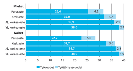 Vuoden 2010 työllisyysasteilla perusasteen tutkinnon suorittaneelle miehelle kertyy työvuosia 25,4 ja naiselle 22,7. Työttömyys on heillä hyvin tavallista ja työttömyysvuosia kertyykin miehille 6,2 ulkopuolelle, naisille 5,6. Tämä tarkoittaa sitä, että joka viides vuosi on työttömyysvuosi. Keskiasteen tutkinto nostaa miesten työvuosien odotearvoa kuudella ja naisten kymmenellä. Alempi korkea-aste lisää miesten ja naisten työvuosia neljällä, ylempi korkea-aste vielä parilla vuodella.