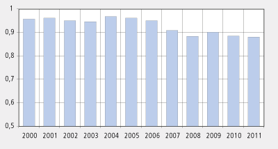 Kuvio. Suomalaisten ja ulkomaalaisten tuntiansioiden suhde vuosina 2000−2011.