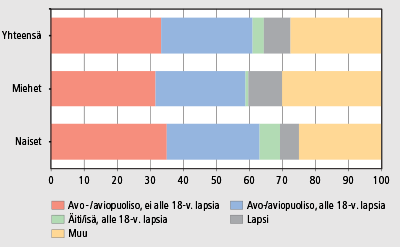 Kuviossa 1 on esitetty 18−64-vuotiaiden miesten ja naisten jakautuminen eri perheasemiin. Työikäisiä miehiä oli vuonna 2011 noin 1 690 000 ja naisia 1 650 000 (Tilastokeskus 2011a). Kuviosta huomataan, että naisista selvästi suurempi osa kuin miehistä oli vanhempia yhden vanhemman perheessä. Naiset olivat myös jonkin verran useammin avo- tai avioliitossa, jossa ei ollut lapsia. Miehet sijoittuivat naisia useammin ryhmään "muu", joka sisältää kuviossa perheväestöön kuulumattomat ja sellaiset ilman puolisoa elävät henkilöt, joiden kaikki lapset ovat täyttäneet 18 vuotta.