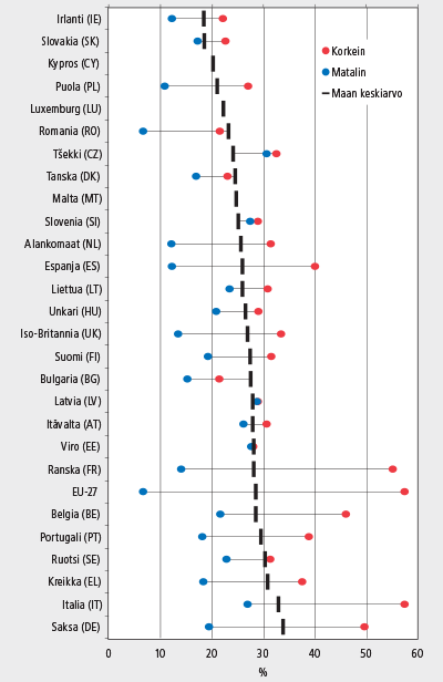Huoltosuhde oli alle 20 prosenttia Irlannissa ja Slovakiassa. Näissä maissa myös kaupunkien vaihtelu oli melko vähäistä.