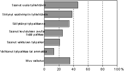 Työelämässä toimineista ilmoitti 77 prosenttia osallistuneensa joskus koulutukseen työssä tai ammattiinsa liittyvistä syistä. Lähes puolet heistä koki hyötyneensä koulutuksesta saamalla sen vuoksi uusia työtehtäviä. Reilu kolmannes katsoi siirtyneensä koulutuksen seurauksena vaativampiin työtehtäviin ja noin kolmasosa pystyneensä säilyttämään työpaikkansa.