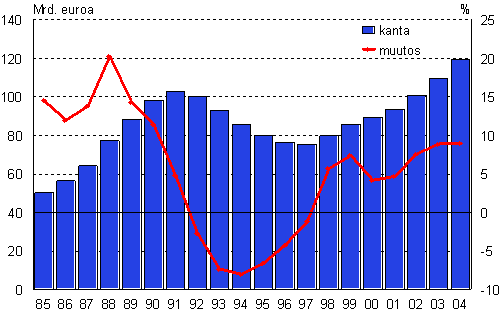 Yleisöluottokanta (mrd. euroa) ja sen vuosimuutos (%) vuosina 1985-2004