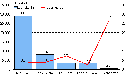 Yritystoiminnan luottokanta 31.12.2004 ja vuosimuutos (%) suuralueittain vuonna 2004