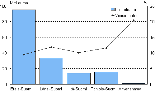 Yleisöluottokanta (milj. euroa) 31.12.2007 ja vuosimuutos (%) suuralueittain vuonna 2007