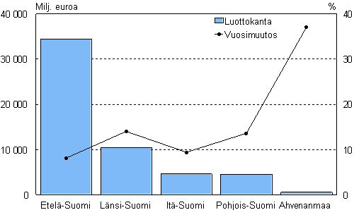 Yritystoiminnan luottokanta 31.12.2007 ja vuosimuutos (%) suuralueittain vuonna 2007