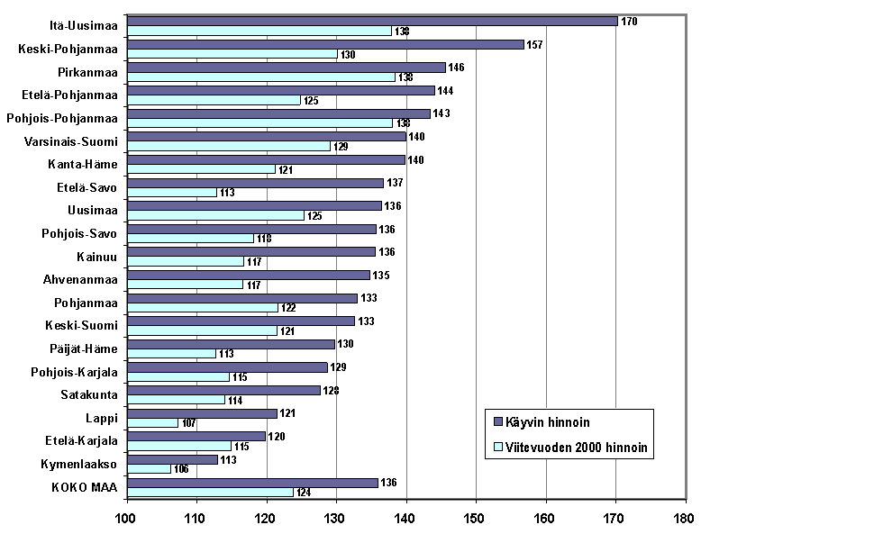 Bruttokansantuote on kasvanut 2000-luvulla nopeimmin Itä-Uudellamaalla. Maakunnan 70 prosentin kasvusta miltei puolet on kuitenkin peräisin alueen tuottamien tuotteiden kohonneista hinnoista. Vuoden 2000 viitehinnoin mitatulla 38 prosentin kasvulla Itä-Uusimaa jakaa kärkipaikan Pirkanmaan ja Pohjois-Pohjanmaan kanssa (ks. kuvio). Myös Keski-Pohjanmaan bruttokansantuotteen kasvu perustuu tuotannon suotuisaan hintakehitykseen.