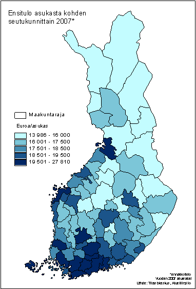 Ensitulo asukasta kohden seutukunnittain 2007*, euroa