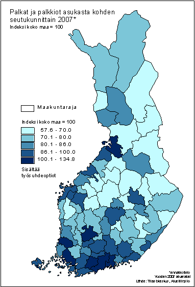 Palkat ja palkkiot asukasta kohden seutukunnittain 2007*, indeksi koko maa = 100
