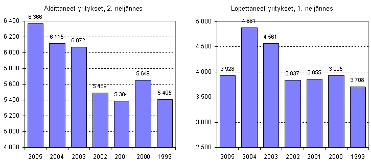Lähde: Yritys- ja toimipaikkarekisteri: Aloittaneet ja lopettaneet yritykset. Aloittaneet yritykset 2005, 2. neljännes; lopettaneet yritykset 2005, 1. neljännes. Tilastokeskus