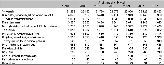 Taulukko 1: Aloittaneet yritykset toimialoittain vuonna 2005.