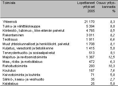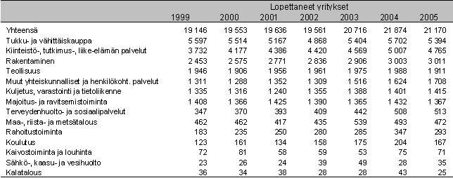 Taulukko 3: Lopettaneet yritykset toimialoittain vuonna 2005.