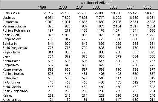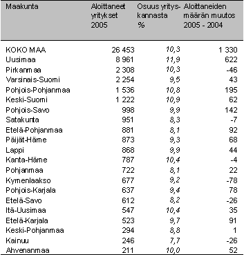 Taulukko 5: Aloittaneet yritykset maakunnittain vuonna 2005.