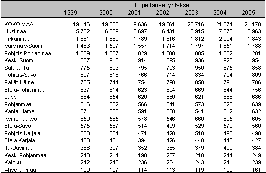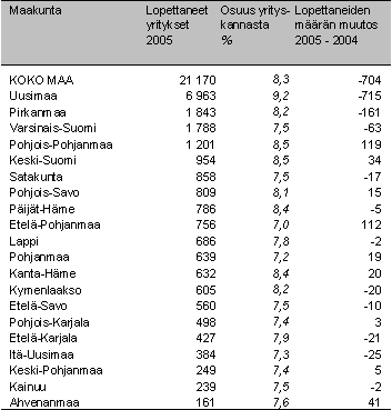 Taulukko 7: Lopettaneet yritykset maakunnittain vuonna 2005.