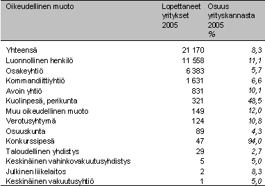 Vuonna 2005 toimintansa lopetti 11 558 liikkeen- tai ammatinharjoittajayritystä, 6 383 osakeyhtiötä ja 1 631 kommandiittiyhtiötä. Lopettaneista yrityksistä 54,6 prosenttia oli oikeudelliselta muodoltaan luonnollisia henkilöitä ja 30,2 prosenttia osakeyhtiöitä.