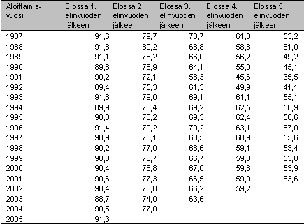 Taulukko 12: Yritysten eloonjäämisasteet (% kaikista aloittaneista) aloittamisvuoden mukaan.