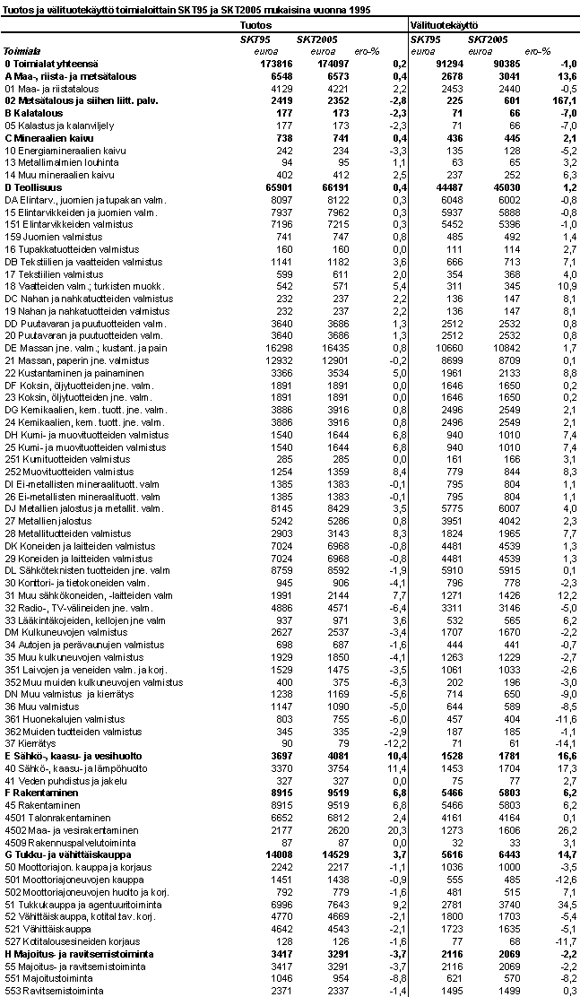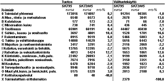 Taulukkoon 1 on koottu vuoden 1995 tuotoksen ja välituotekäytön tiedot päätoimialoittain SKT95 ja SKT2005 järjestelmien mukaisina sekä näiden taloustoimien erot prosentteina järjestelmien välillä. Koko talouden tasolla kotimainen tarjonta ei oleellisesti poikkea SKT95 ja SKT2005 järjestelmien välillä, mutta jo päätoimialatasolla löytyy yli 10% muutoksia. Välituotekäytön osalta muutokset ovat suurempia.