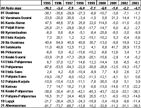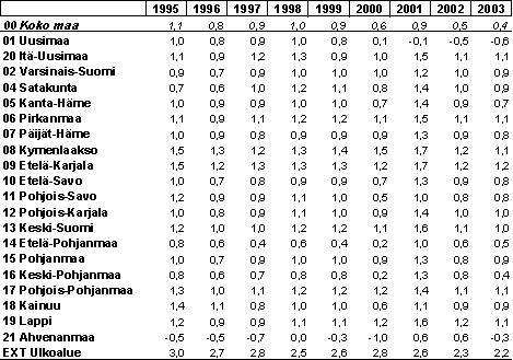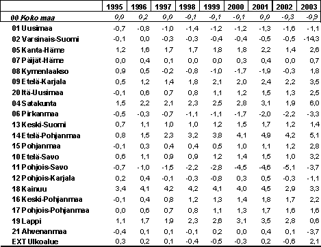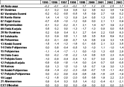Taulukkoon 2 on koottu syksyllä 2005 tehdyn FISIM-uudistuksen vaikutus SKT2000 mukaisen aluetilinpidon tietoihin maakunnittaisessa arvonlisäyksessä. FISIM uudistuksen vaikutus vaihtelee vuosittain ja maakunnittain eli alueellisessa rakenteessa tapahtuu jatkuvaa muutosta. Vuoden 1995 osalta maakunnittainen vaihteluväli on -0,5%:sta 1,5%:iin ja vuoden 2002 -0,5%:sta 1,2%:iin. Lisäksi ulkoalueella muutos on ollut vielä voimakkaampi.