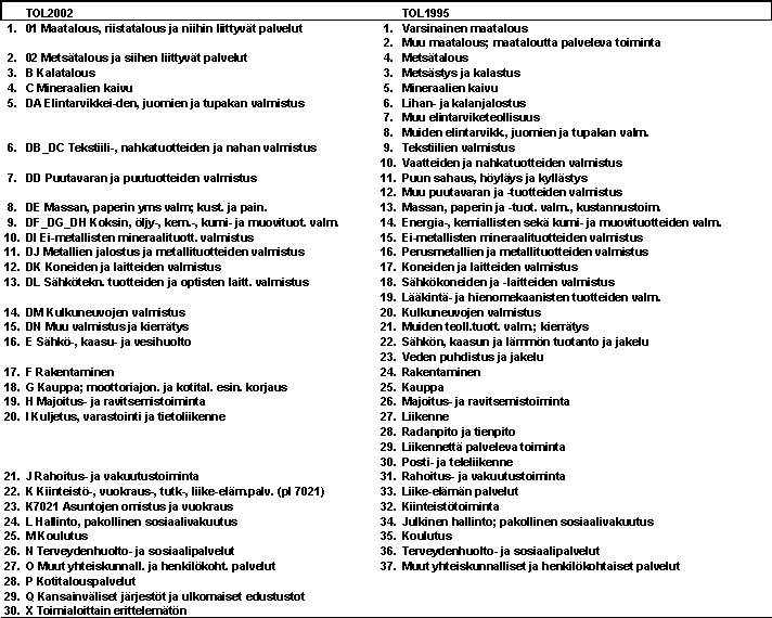 Taulukko 7. Toimialat alueellisissa panos-tuotos -tutkimuksissa vuosille 2002 ja 1995