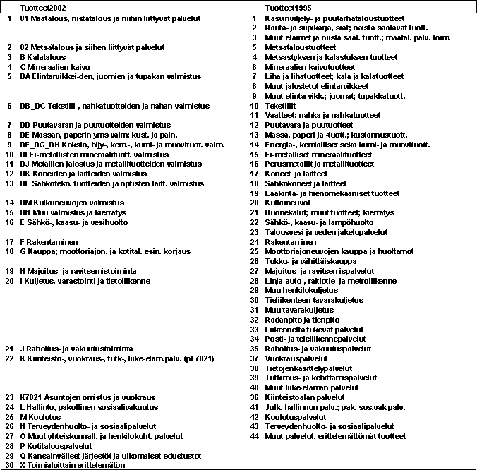 Taulukko 8. Tuotteet alueellisissa panos-tuotos -tutkimuksissa vuosille 2002 ja 1995