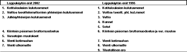 Vuonna 1995 loppukäyttö oli jaettu yhdeksään ryhmään, vuonna 2002 luokkia oli seitsemän. Vuonna 1995 julkisen sektorin kulutusmenot oli jaettu valtion, kuntien ja sosiaaliturvarahastojen kulutusmenoihin. Vuonna 2002 on vain julkisyhteisöjen kulutusmenot yhteensä.