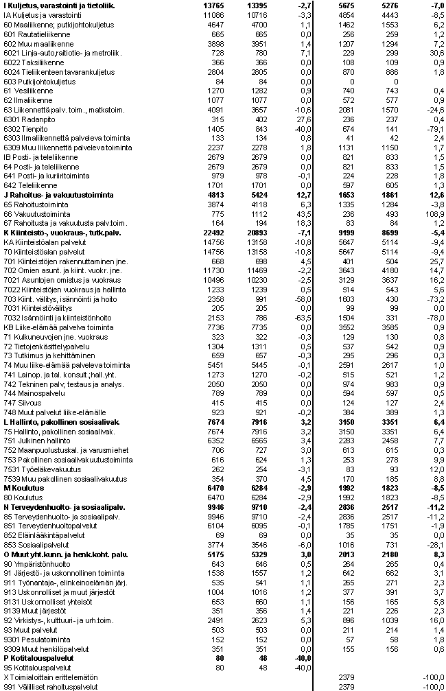Suurimmat suhteelliset muutokset tuotoksessa on tarkemmalla toimialatasolla tapahtuneet