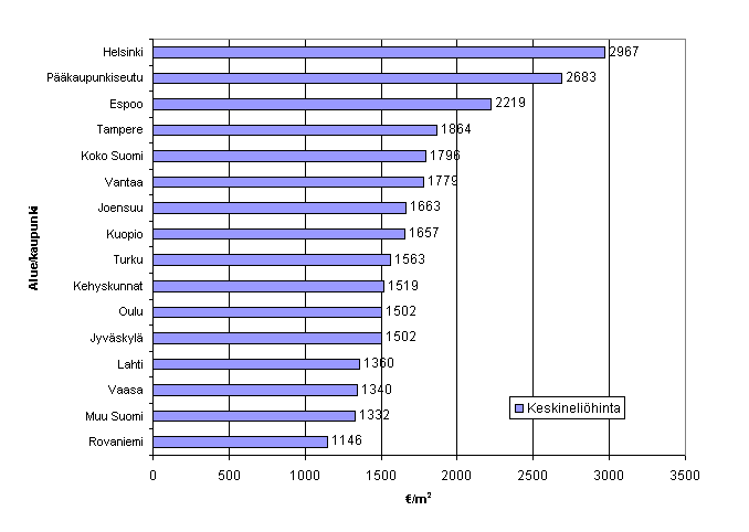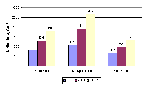 Suomen kerrostaloasuntojen keskineliöhinta oli 1 796 €/m2 vuoden 2006 1. neljänneksellä. Pääkaupunkiseudulla kerrostaloasuntojen keskineliöhinnat ovat yli kaksinkertaiset muuhun Suomen verrattuna. Pääkaupunkiseudulla keskineliöhinta on 2 683 €/m2 ja muualla Suomessa 1 332 €/m2.