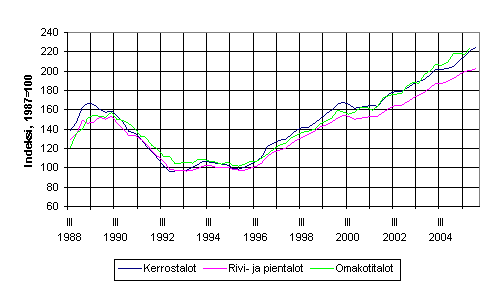 Asuntojen hintakehitys talotyypeittäin on pitkällä aikavälillä ollut verrattain samankaltaista. Kuviossa 3 on esitetty kerrostalojen, rivi- ja pientalojen sekä omakotitalojen nimellinen hintakehitys Suomessa vuodesta 1987 lähtien.