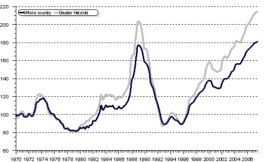 According to preliminary data, prices of dwellings rose during the third quarter of 2007. The prices of dwellings in old blocks of flats rose by an average of 0.7 per cent in the whole country, when compared with the previous quarter. Prices went up by 0.7 per cent in Greater Helsinki and by 0.8 per cent in the rest of Finland. These data derive from the statistics on the prices of dwellings compiled by Statistics Finland on the basis of the Tax Administration's data. Preliminary data comprise roughly two-thirds of the transactions in dwellings in old blocks of flats and in terraced housing.