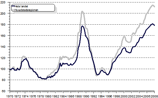 Realpriserna på bostäder sjönk redan under två kvartal i följd. Enligt de preliminära uppgifterna sjönk realpriserna med 1,0 procent i hela landet under det första kvartalet år 2008 jämfört med föregående kvartal. De nominella priserna ökade med i genomsnitt 0,3 procent i hela landet. I huvudstadsregionen var priserna alltjämt på tidigare nivå och på andra håll i Finland var ökningen i genomsnitt 0,5 procent.