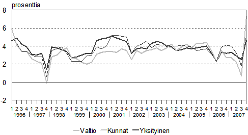 Korjattu 25.2.2008. Edellisestä 8.2.2008 päivitetystä kuviosta puuttui välistä ensimmäisen neljänneksen 2007 tiedot, jolloin seuraavien neljänneksien tiedot siirtyivät yhdellä neljänneksellä taaksepäin.