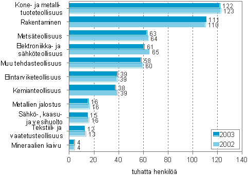 Palkatun henkilöstön määrä teollisuudessa ja rakentamisessa yhteensä (toimialat C, D, E, F) oli noin 539 000 henkilöä vuonna 2003 vähentyen lähes 2 prosenttia vuoteen 2002 verrattuna. Palkatun henkilöstön määrä väheni noin 9 900 henkilöllä edellisvuodesta. Mineraalien kaivussa (C) henkilöstön määrä pysytteli vuoden 2002 tasolla.