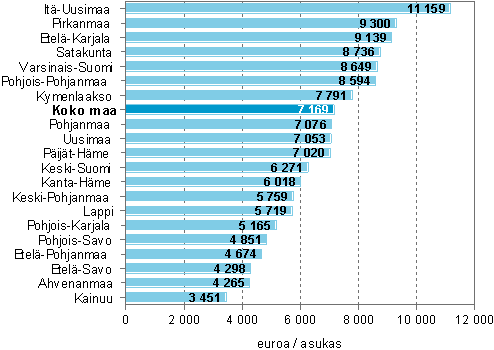 Teollistunein maakunta vuonna 2003 oli Itä-Uusimaa, jossa jalostusarvon kertymä asukasta kohti oli 11 159 euroa. Pirkanmaalla jalostusarvoa kertyi asukasta kohti 9 300 euroa ja Etelä-Karjalassa 9 139 euroa. Vähiten jalostusarvoa asukasta kohti syntyi Kainuussa, 3 451 euroa. Koko maan keskiarvo teollisuuden ja rakentamisen jalostusarvon kertymässä asukasta kohti oli 7 169 euroa vuonna 2003.