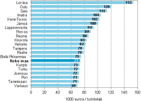 Kuviossa näkyy työn tuottavuus teollisuudessa (jalostusarvo/henkilöstö) seutukunnittain (20 tuottavinta) vuonna 2003. Tuottavuuden tasoa seutukunnassa selittää eniten toimipaikkojen toimiala. Tuottavuusvertailun kärjessä oli Loviisan seutukunta (153 069 euroa), jonka jalostusarvo muodostuu sähköhuollosta ja kemianteollisuudesta. Oulun seutukunnassa jalostusarvo muodostuu elektroniikka- ja sähköteollisuudesta sekä metsäteollisuudesta. Salon seutukunnassa suurin osa sen jalostusarvosta syntyy toimialalla 30-33 eli elektroniikkatuotteiden valmistuksesta. Imatran seutukunnassa jalostusarvo muodostuu metsäteollisuudesta ja sähköhuollosta sekä Jämsän seutukunnassa metsäteollisuudesta. Metsäteollisuus ja metallien jalostus ovat taas tärkeimmät toimialat Kemi-Tornion seutukunnassa. Koko maan jalostusarvo työntekijää kohden oli 73 180 euroa vuonna 2003.