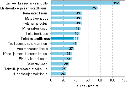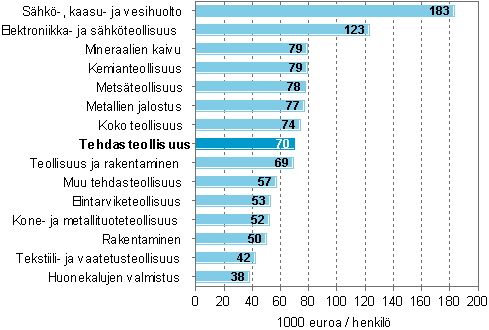 Elektroniikka- ja sähköteollisuudessa jalostusarvo palkattua henkilöä kohden oli 123 323 euroa, mineraalien kaivussa, 79 343 euroa ja kemianteollisuudessa, 79 259 euroa. Jalostusarvo jaettuna henkilöstön lukumäärällä oli keskimääräistä pienempää rakentamisessa (49 908 euroa), tekstiili- ja vaatetusteollisuudessa (41 756 euroa) ja huonekalujen valmistuksessa (38 160 euroa).