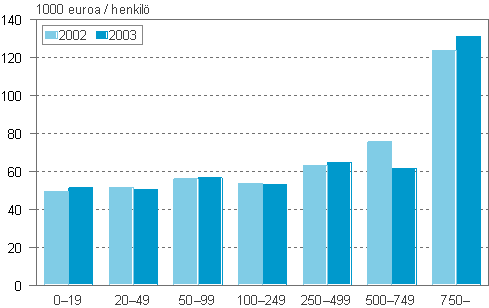 20-49 henkilön toimipaikoissa tuottavuus laski runsaat 2 prosenttia, kun henkilöstön määrä lisääntyi vajaat 2 prosenttia. Myös 500-749 henkilöä työllistävissä toimipaikoissa tuottavuus laski reippaasti, reilut 18 prosenttia henkilöstön määrän pysyessä lähes vuoden 2002 tasolla. Sen sijaan 250-499 henkilöä työllistävissä toimipaikoissa tuottavuus kasvoi lähes 3 prosenttia, kun henkilöstön määrä väheni 6 prosenttia.
