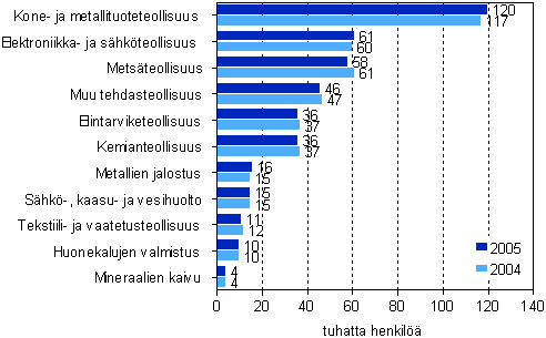 Palkatun henkilöstön määrä koko teollisuudessa (C, D, E) oli yli 414 000 henkilöä vuonna 2005 vähentyen 0,7 prosenttia vuodesta 2004. Palkatun henkilöstön määrä väheni lähes 3 000 henkilöllä edellisvuodesta. Mineraalien kaivussa (C) palkatun henkilöstön määrä kasvoi runsaat 6 prosenttia vuotta aiempaan verrattuna.