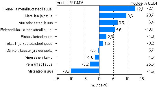 Tehdasteollisuuden jalostusarvo kasvoi eniten kone- ja metallituoteteollisuudessa, metallien jalostuksessa sekä elektroniikka- ja sähköteollisuudessa. Tuotannon jalostusarvo lisääntyi myös elintarviketeollisuudessa sekä tekstiili- ja vaatetusteollisuudessa. Tuotannon jalostusarvo laski eniten metsäteollisuudessa. Myös kemianteollisuudessa jalostusarvo supistui vuotta aiemmasta.