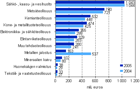 Käyttöomaisuuden investoinnit vähenivät koko teollisuudessa yli prosentin ja tehdasteollisuudessa yli 2 prosenttia vuonna 2005. Mineraalien kaivussa investoinnit sen sijaan lisääntyivät reippaasti, yli 28 prosenttia. Koko teollisuuden yhteenlasketut investoinnit käyttöomaisuuteen olivat noin 4,1 miljardia euroa, josta tehdasteollisuuden osuus oli 2,9 miljardia euroa.