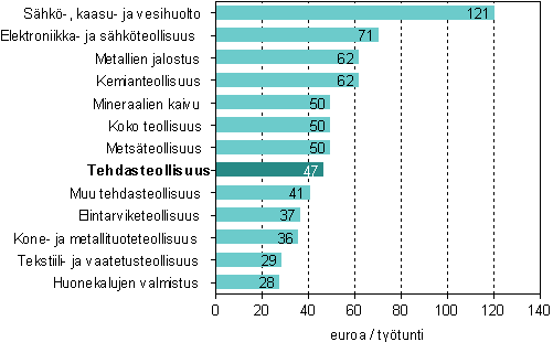 Elektroniikka- ja sähköteollisuudessa jalostusarvo palkattua henkilöä kohden oli 117 037 euroa, lisäystä edellisvuodesta oli runsaat 4 prosenttia. Metsäteollisuudessa työn tuottavuus (75 253) väheni 4,5 prosenttia vuotta aiemmasta. Jalostusarvo jaettuna palkatun henkilöstön lukumäärällä oli keskimääräistä pienempää elintarviketeollisuudessa, kone- ja metallituoteteollisuudessa, tekstiili- ja vaatetusteollisuudessa sekä huonekalujen valmistuksessa.