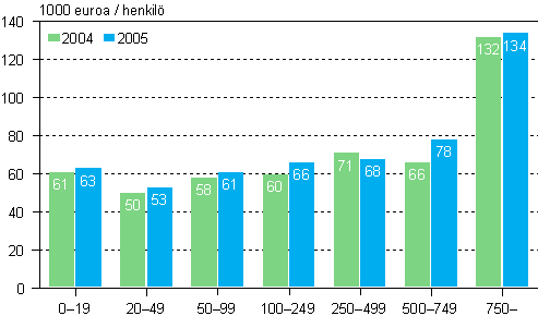 Tehdasteollisuuden toimipaikkojen tuottavuus suuruusluokittain vuosina 2004 ja 2005 (1 000 euroa / henkilö)
