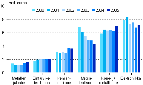 Jalostusarvon kehitys tehdasteollisuuden suurimmilla päätoimialoilla vuosina 2000-2005