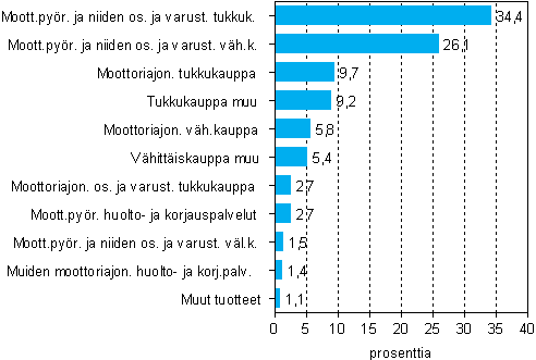 Autokaupan liikevaihdon prosenttiosuus (%) tuotteittain toimialalla mootoripyörien ja niiden osien ja varusteiden kauppa, huolto ja korjaus 5040