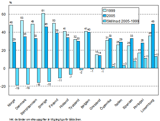 Figur 1.1. Andelen deltagare i utbildning i kursform av alla arbetstagare i Europa under åren 1999 och 2005 enligt förändring av deltagarprocent