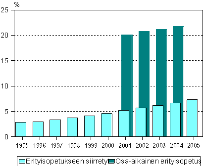 Syksyllä 2005 erityisopetukseen oli otettu tai siirretty lähes 43 000 oppilasta, 7 prosenttia kaikista peruskoulun oppilaista. Vaikka peruskoululaisten määrä väheni prosentilla, erityisopetukseen siirrettyjen määrä kasvoi edellisvuodesta runsaalla 7 prosentilla. Eniten lisääntyi niiden oppilaiden määrä, joilla erityisopetuksen perusteena oli tunne-elämän häiriö tai sosiaalinen sopeutumattomuus. Lähes 130 000 peruskoulun oppilasta eli 22 prosenttia oppilaista sai osa-aikaista erityisopetusta lukuvuonna 2004-2005 lievien oppimis- ja sopeutumisvaikeuksien vuoksi. Lisäystä edelliseen lukuvuoteen oli 3 prosenttia. Eniten kasvoi matematiikan oppimisvaikeuksien takia osa-aikaista erityisopetusta saavien määrä. Tiedot ilmenevät Tilastokeskuksen koulutustilastoista.