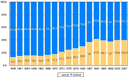 Naisten ja miesten osuus ehdokkaista eduskuntavaaleissa 1948 - 2007, %