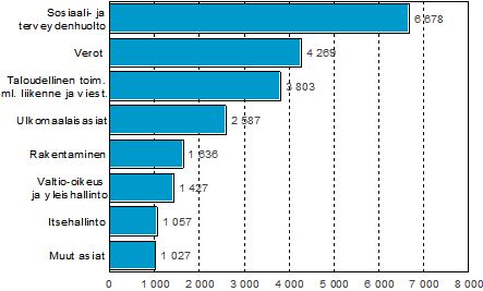 Tilastokeskuksen mukaan hallinto-oikeudet käsittelivät eri viranomaisten päätöksistä tehtyjä valituksia ja hallintoriita-asioita 22 484 vuonna 2005. Suurin osa hallinto-oikeuksien ratkaisemista asioista koskee sosiaali- ja terveydenhuoltoa. Sosiaali- ja terveydenhuoltoa koskevien asioiden osuus kaikista ratkaistuista asioista oli 30 prosenttia ja verojen osuus 19 prosenttia. Yli 60 prosentissa kaikista ratkaistuista asioista alemman viranomaisen päätöstä ei muutettu. Asiaryhmittäin tarkasteltuna ympäristöä ja veroja koskevissa asioissa ratkaisu oli kantajalle useammin myönteinen kuin muissa asioissa. Ympäristöä koskevia asioita muutettiin 39 prosentissa ja veroja 26 prosentissa tapauksista. Muissa asioissa vastaava osuus oli 12 prosenttia.