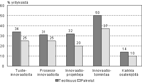 Vuosina 2002-2004 innovaatiotoimintaa harjoitti kaikkiaan 43 prosenttia yrityksistä, tuoteinnovaatioita oli 30 prosentilla ja prosessi-innovaatioita 28 prosentilla. Teollisuusyrityksistä innovaatiotoimintaa harjoitti puolet mainitulla ajanjaksolla. Tuoteinnovaatioita oli 34 prosentilla, prosessi-innovaatioita 31 prosentilla ja innovaatioihin tähtääviä projekteja 32 prosentilla yrityksistä. Kaikkiaan 14 prosentilla teollisuusyrityksistä oli näitä kaikkia innovaatiotoiminnan osatekijöitä eli tuote- ja prosessi-innovaatioita sekä muita innovaatioprojekteja. Tiedot perustuvat Tilastokeskuksen tekemään tutkimukseen, jossa yrityksiltä tiedusteltiin innovaatioihin liittyvää toimintaa (tutkimus kattoi tarkasteltujen toimialojen vähintään 10 henkilöä työllistävät yritykset).