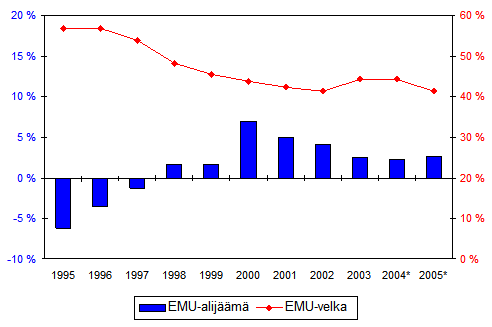 Lähde: Julkisyhteisöjen alijäämä ja bruttovelka EMU-kriteerien mukaisina 2005. Tilastokeskus